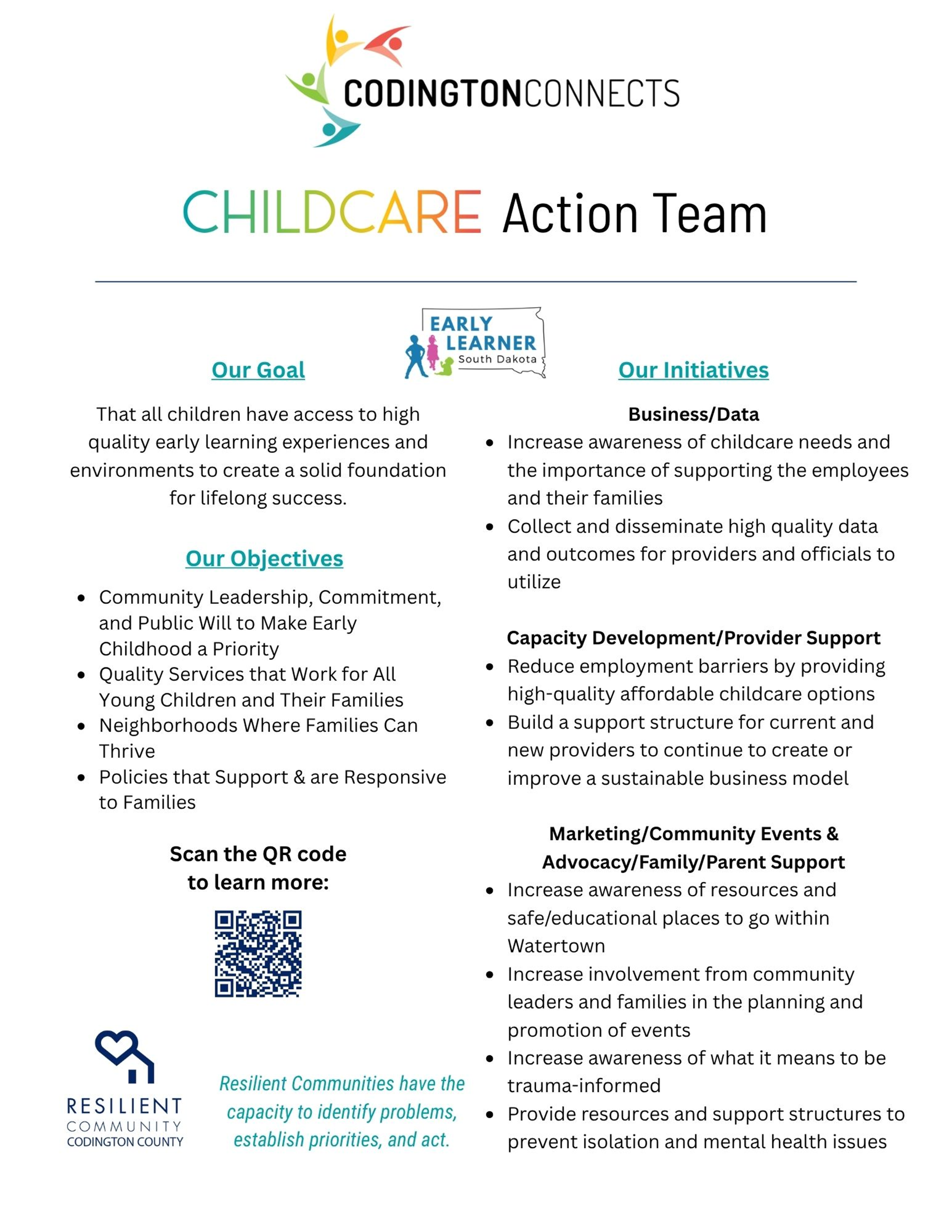 Additional Information and Supportive Documents on the Childcare Initiative: Codington County Child Care Survey Codington County Child Care Survey Results- Infographic Community Presentation: May 2024 Codington County Child Care Providers Registered with the State Choosing Child Care Child Care Analysis Report Child Care Assistance