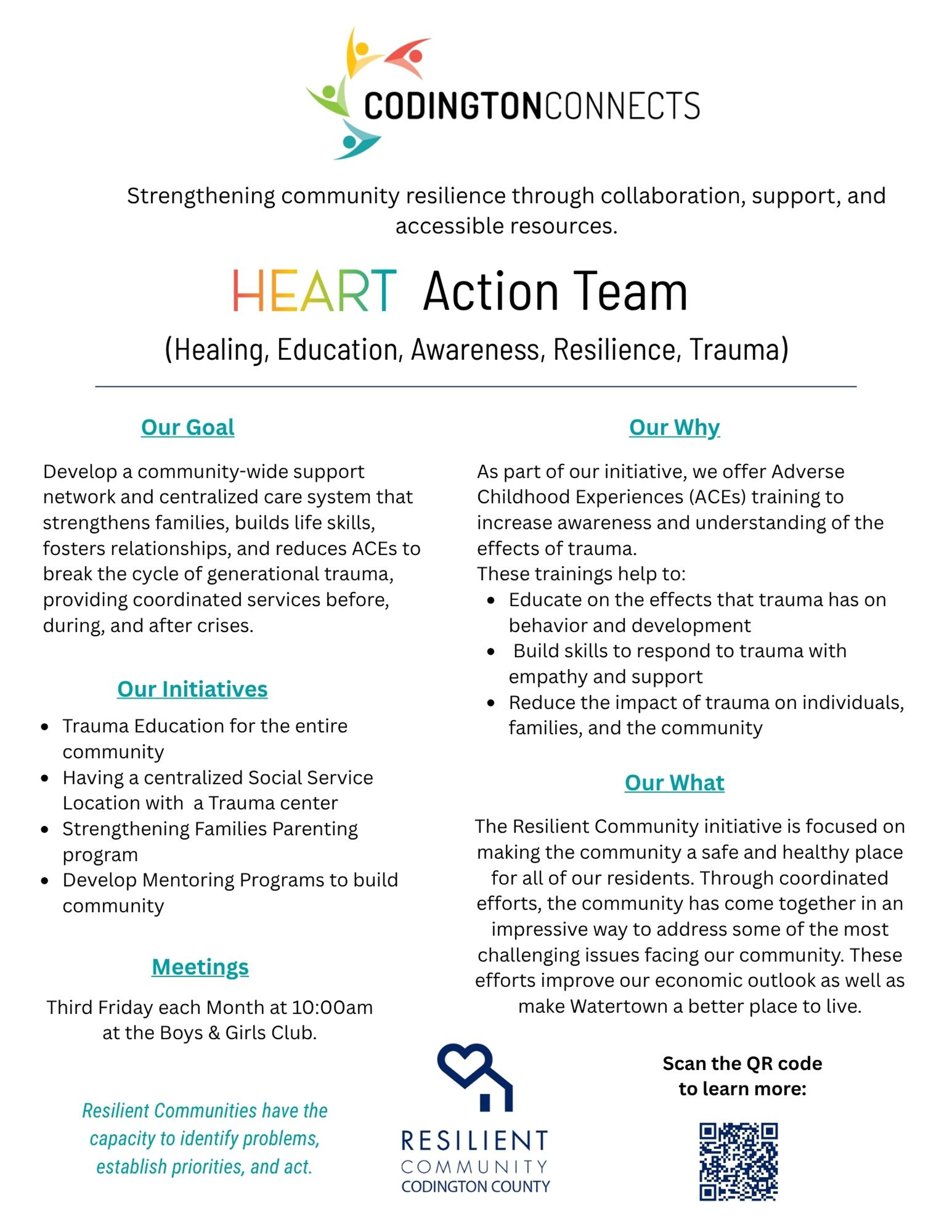 - Develop and provide training and programming that builds capacity for life skills and resiliency among Codington County residents (adult skills, basic skills, generational poverty).