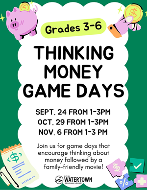 We have 2 fun kids programs coming up for early out days! Starting at 1pm, join us for Lego Club and financial literacy games!