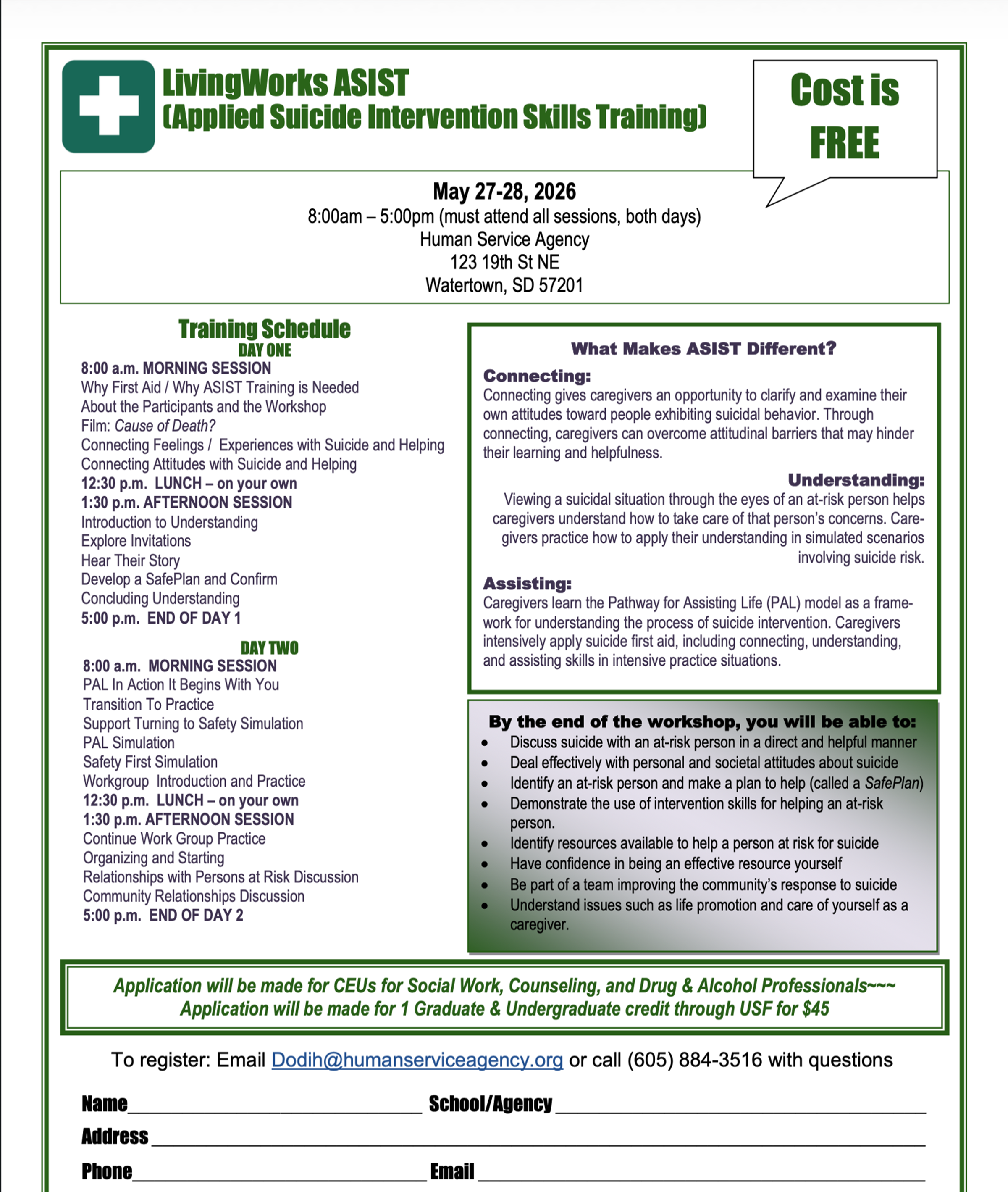 Add to Calendar5/27/2026 8:00 am5/28/2026 5:00 pmAmerica/BismarckLivingWorks Assist Free TrainingHuman Service Agency
