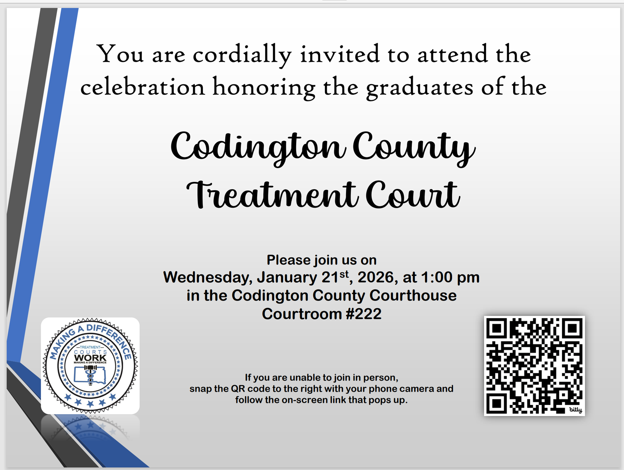 You are cordially invited to attend the celebration honoring the graduates of the Codington County Treatment Court.