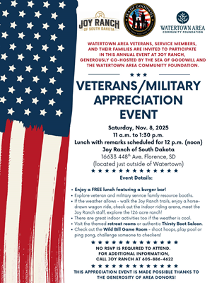Watertown area veterans, service members, and their families are invited to participate in this annual appreciation event held at Joy Ranch, generously co-hosted by the Sea of Goodwill and the Watertown Area Community Foundation.